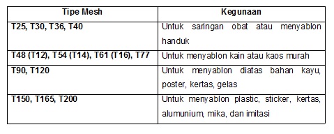 Mesh yang bernomor rendah umumnya mempunyai lubang atau pori-pori yang relative besar dan kasar. Mesh bernomor rendah sangat cocok digunakan untuk menyablon kaos murah. Sedangkan mesh bernomor tinggi umumnya mempunyai lubang yang lebih kecil atau halus sehingga cocok untuk menyablon plastic dan kertas. Penggunaan penomoran mesh dapat dilihat pada tabel berikut: